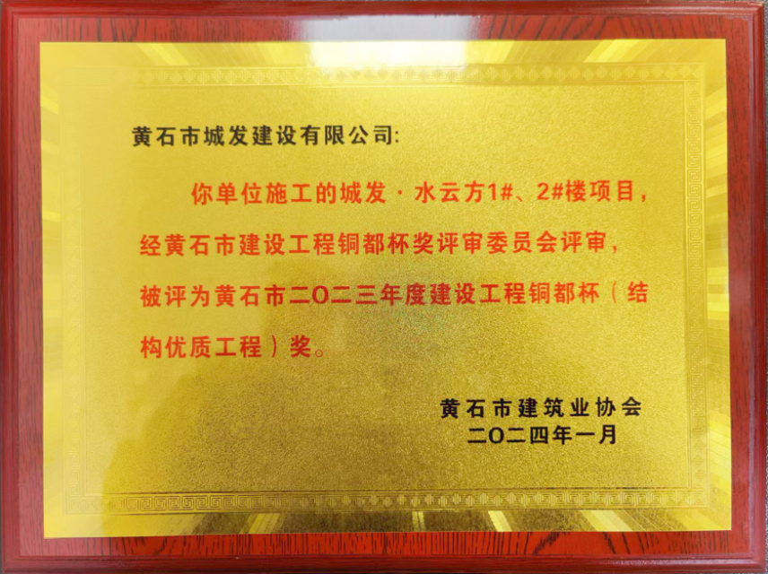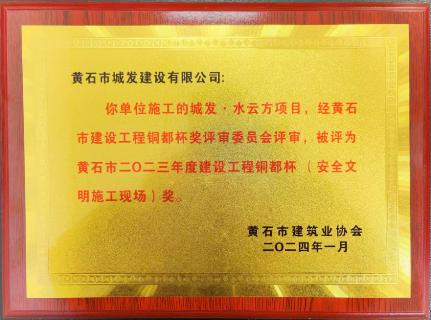 近日,由黃石市城發(fā)建設(shè)有限公司承建的城發(fā)·水云方項(xiàng)目榮獲黃石市2023年度建設(shè)工程安全文明施工現(xiàn)場和結(jié)構(gòu)優(yōu)質(zhì)工程獎(jiǎng)。